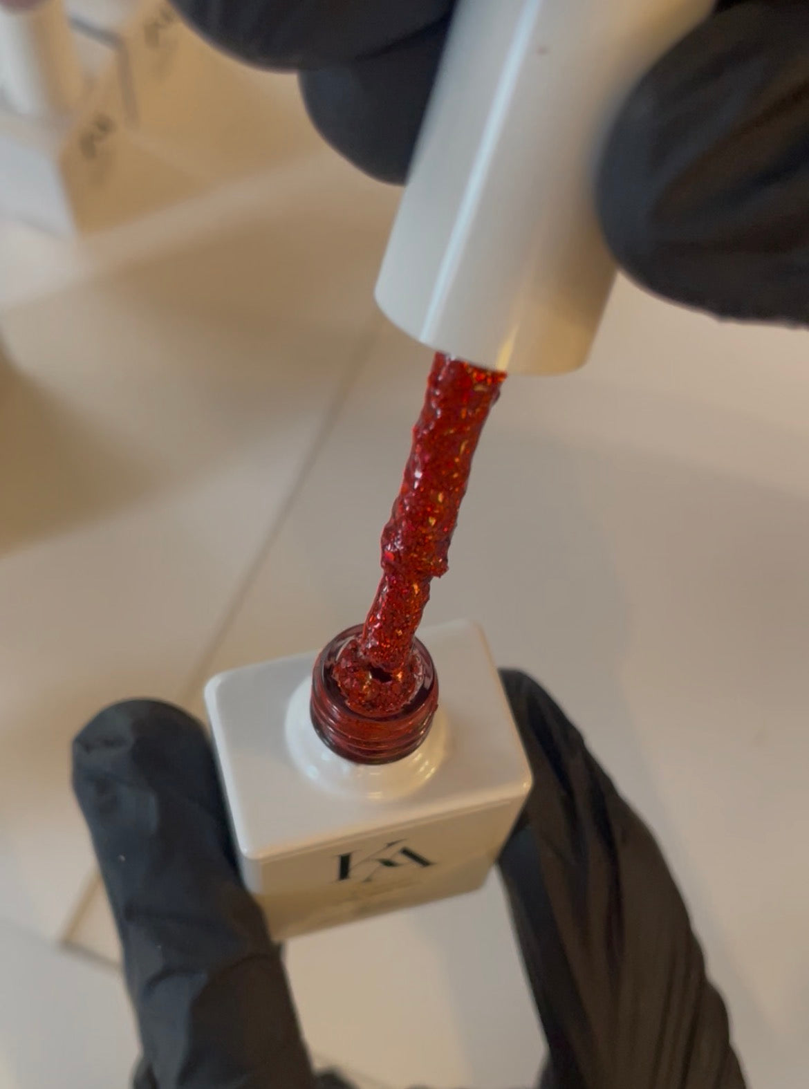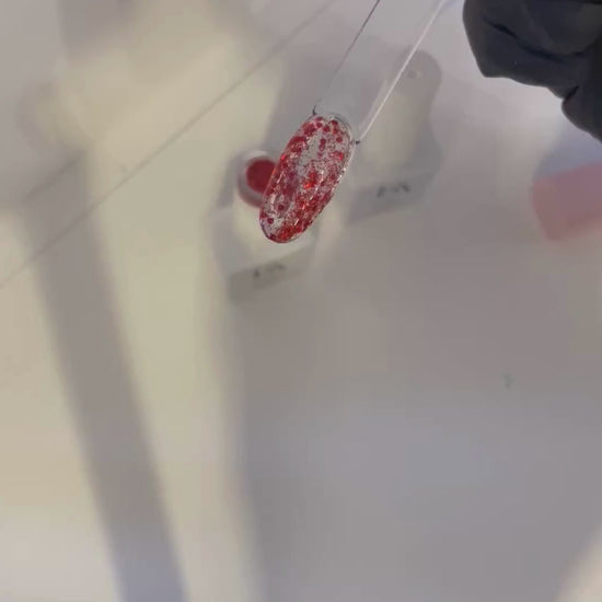 Un rouge profond mêlé à des paillettes lumineuses qui captent la lumière et transforment instantanément vos ongles en véritables bijoux de saison.